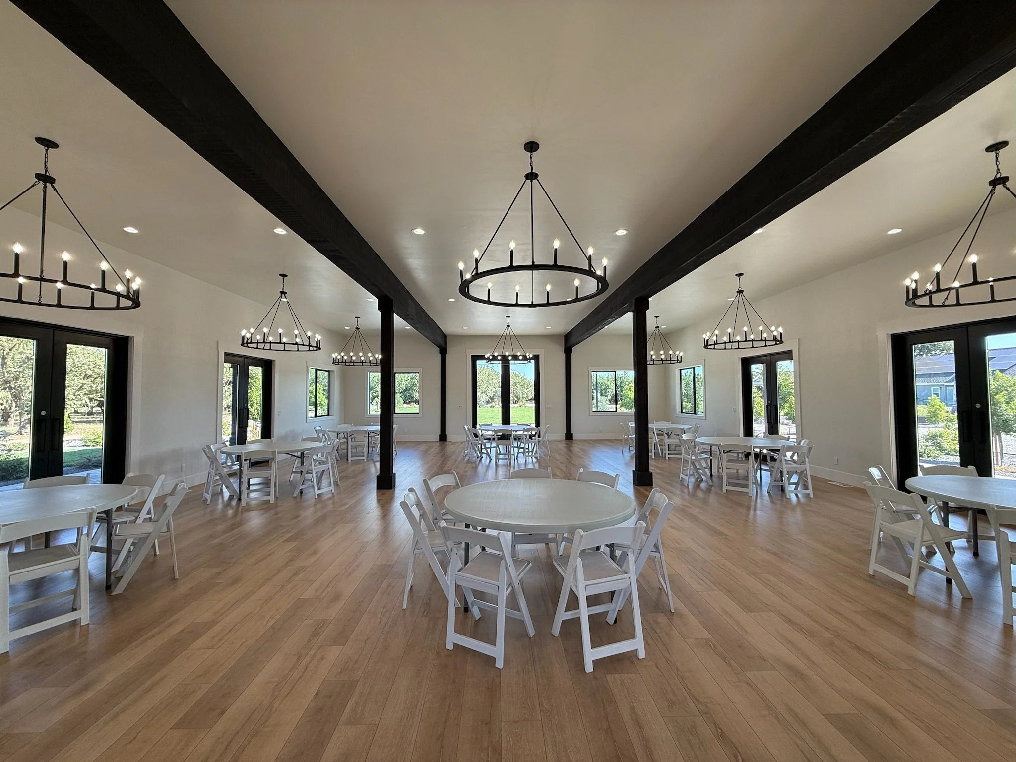 Our picturesque white barn features two sets of French doors on each side and stunning 10-foot French doors at the front entry, creating a warm and inviting atmosphere. Black-accented finishes, high vaulted ceilings, and beautiful large glass windows. Eight elegant chandeliers and luminous hanging lights over the patio.